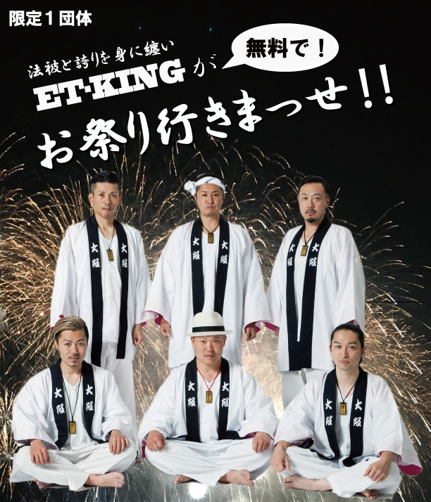 1999年の結成以来、お祭りの代名詞でもある“法被”を身に纏い、全国でライブを行っているET-KING。結成20周年を迎えるにあたり、もっと全国の『お祭り』を知りたい!体感したい!という想いと、今まで応援してくださっている全国のみなさんに感謝の気持ちを伝えるために、 『ET-KINGがお祭り行きまっせ‼』と銘打って、無料でライブを行います!日本国内であればどこからでも応募可能となりますので、ドシドシご応募お待ちしております!